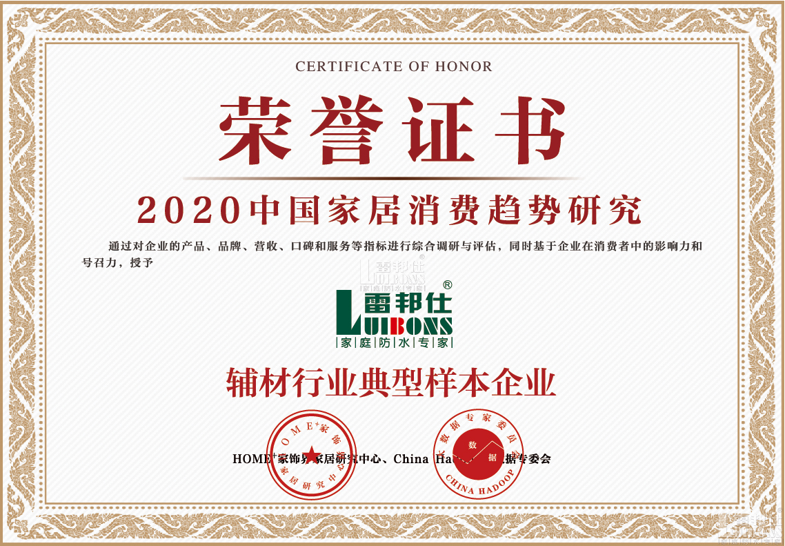 2021年1月27日,HOME家飾界、China Hadoop大數(shù)據(jù)專委會(huì)發(fā)布了2020中國家居消費(fèi)趨勢(shì)研究暨行業(yè)典型樣本企業(yè)成果。雷邦仕成功入選2020中國家居消費(fèi)趨勢(shì)研究輔材行業(yè)典型樣本企業(yè),同時(shí)獲得“2020消費(fèi)趨勢(shì)研究消費(fèi)者喜愛的防水品牌”。